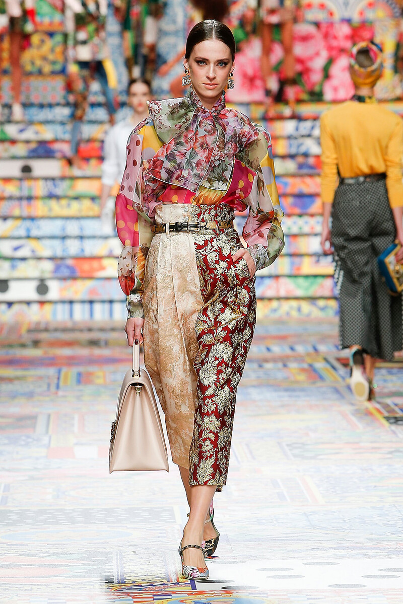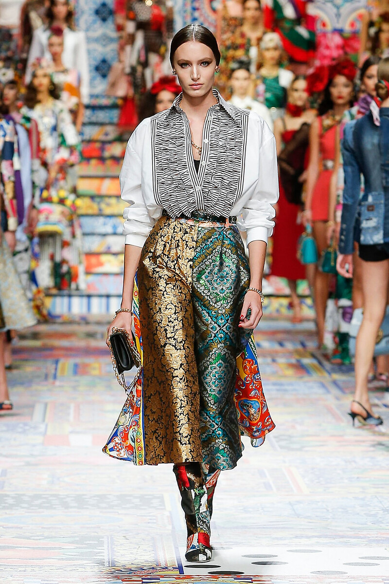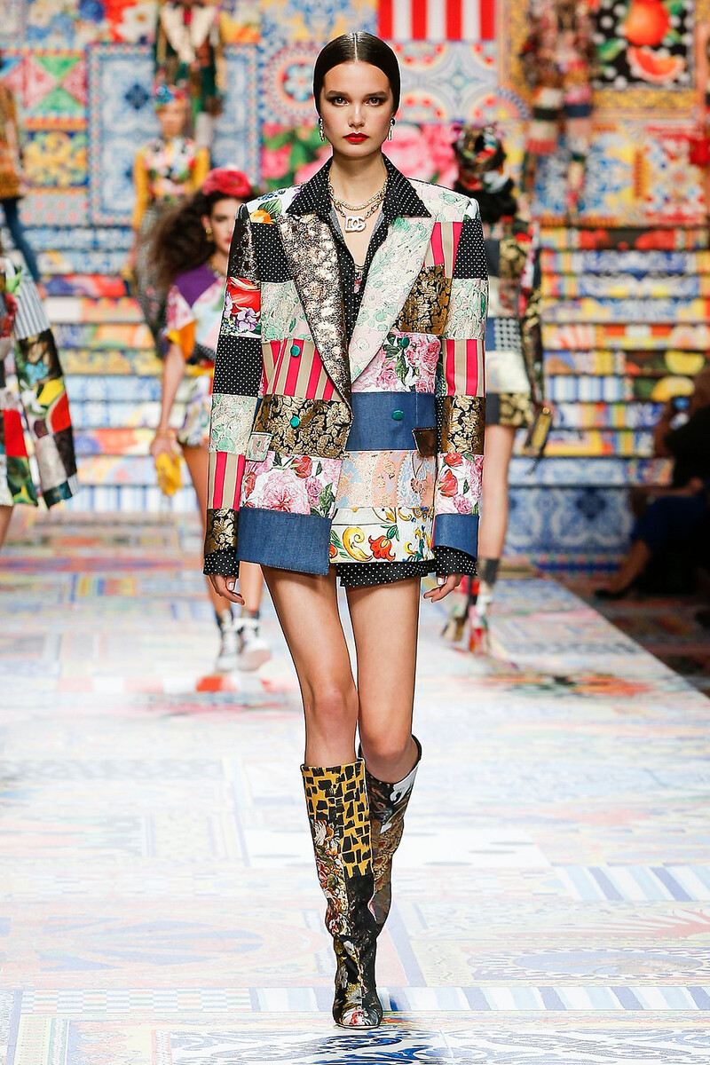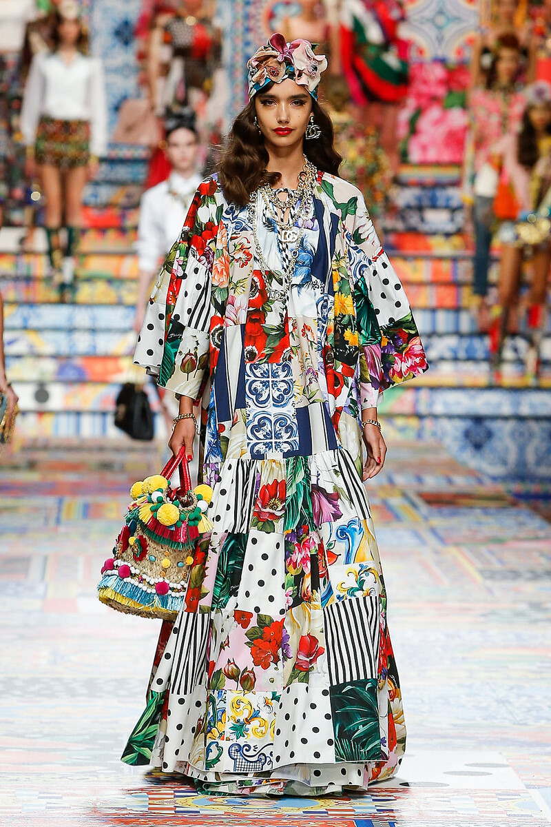 Módne trendy sa neustále opakujú a taký patchwork (špecifická textilná technika, ktorá spočíva v zošívaní malých rôznofarebných kúskov látok tak, aby vytvárali geometrické vzory) sa posledné roky stále vyhrieva na výslní. Jeho prítomnosť v novej kolekcii D&G preto nie je až taká prekvapivá. Ak neberieme do úvahy to, kto bol prvý (možno Dolce ukrýval tieto nákresy a koncept svojej šou v šuplíku celé roky), nová SS2021 je skvelá, bezstarostná a luxusná jazda!