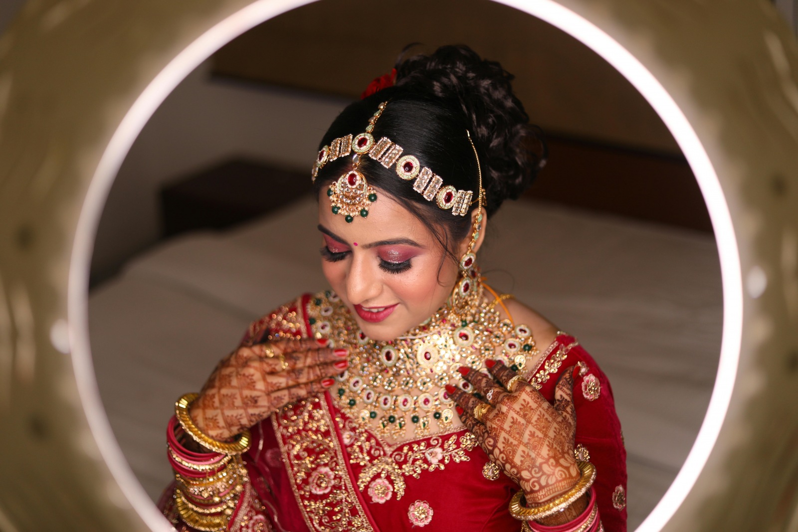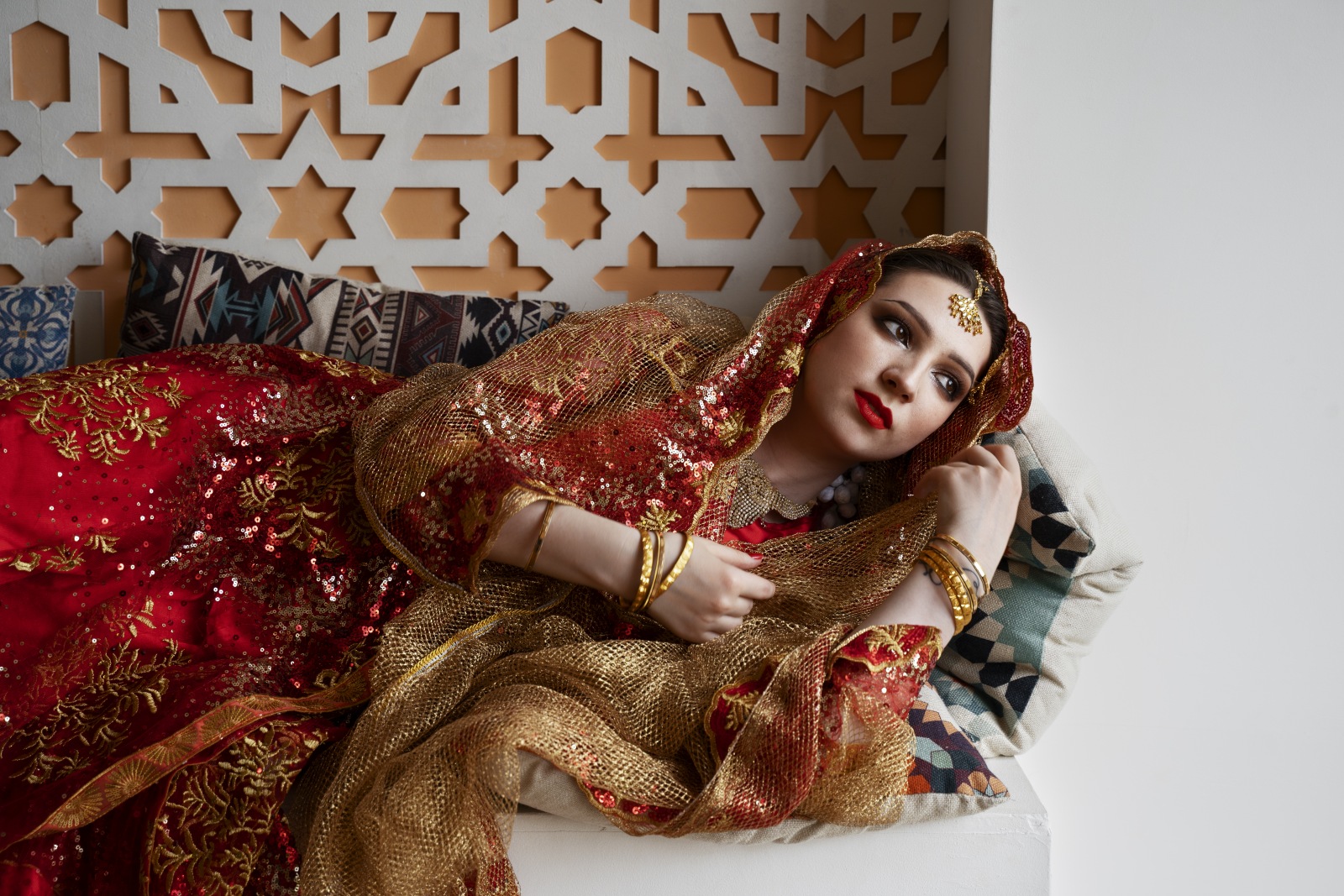 V domě nevěsty je přivítala hudba, zpěv a jasná světla. Nevěsta vyšla na nádvoří jako zjevení – v bílých šatech se zlatou výšivkou, s červenou stuhou kolem pasu symbolizující její panenství. Její krása byla tichá, skromná, ale důstojná. Mladý pár nastoupil do auta a průvod se znovu vydal na cestu – tentokrát jako manželský pár.