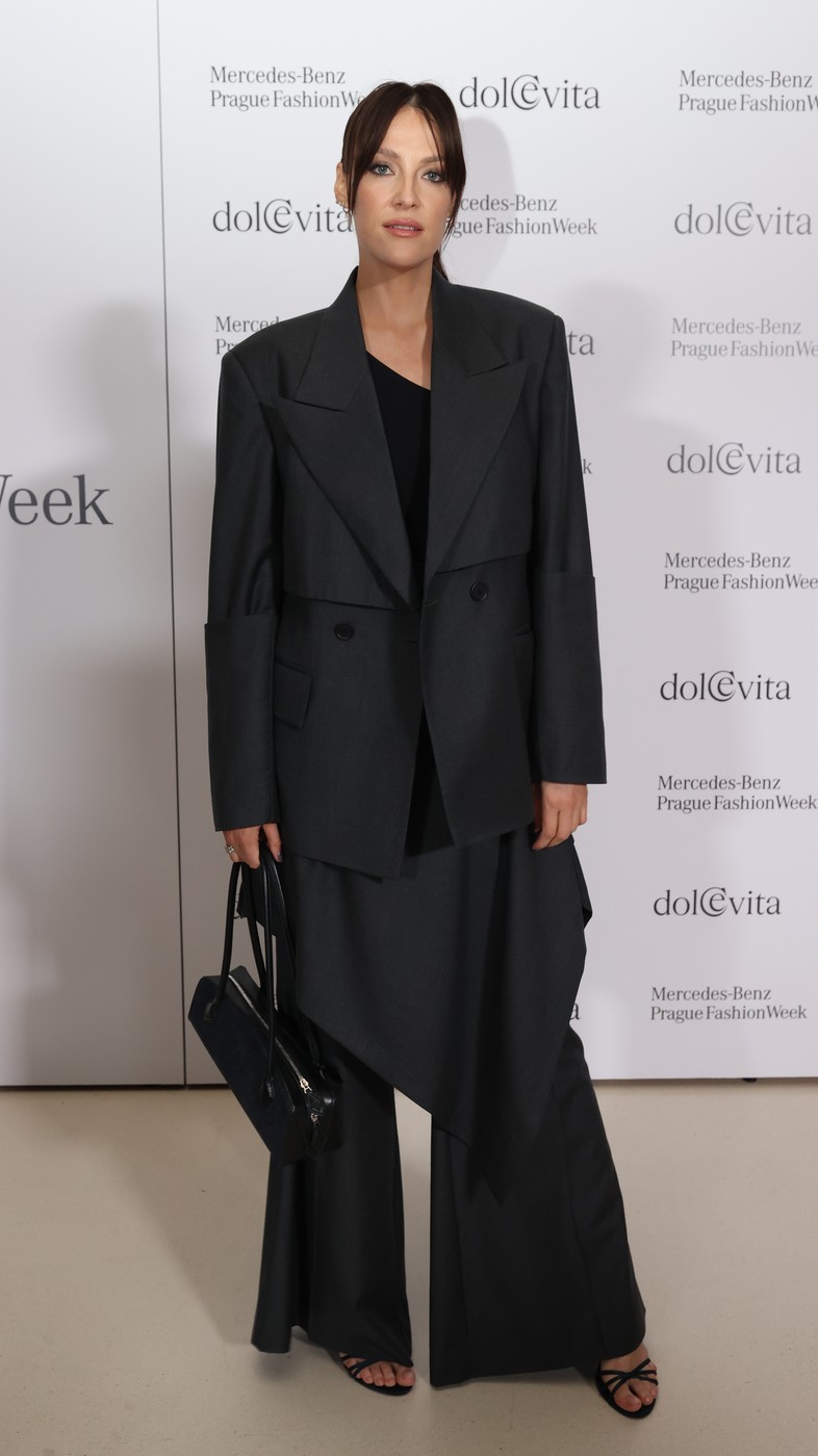 Herečka a tatérka Kateřina Kaira Hrachovcová tentokrát ukázala pořádnou divočinu a znovu potvrdila, že módu bere jako hru. Největším překvapením ale byly její blond vlasy, ve kterých působila svěže, mladistvě a velmi výrazně. Změna jí viditelně prospěla a sluší jí víc, než by mnozí čekali. Na fashion week dorazila v modelu, který nešlo přehlédnout. Oversize bílá košile, krátké černé nabírané šortky připomínající sukni a výrazné punčochy vytvořily look plný energie a rebelského ducha. Černé lodičky a úzké sluneční brýle pak celý styling ještě podtrhly.